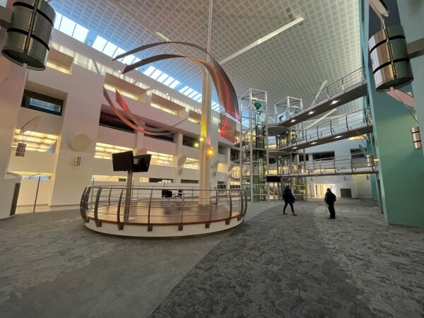 Facilitating presentations and performances in this central area, bleacher seating and a stage were added, connecting to the first-floor walkway.